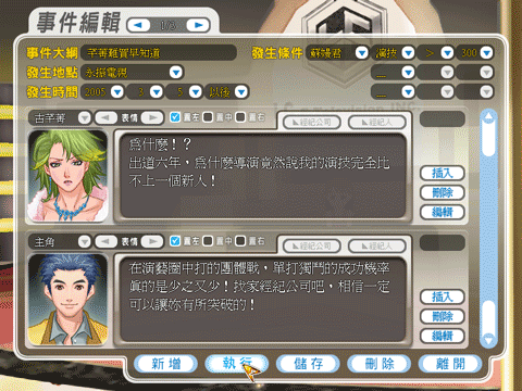 劇本是由數個單一事件累積而成的,在編織出美麗的故事之前,得先決定劇情架構。玩家可隨時新增劇情檔,每個劇情檔最多可設計20個事件。